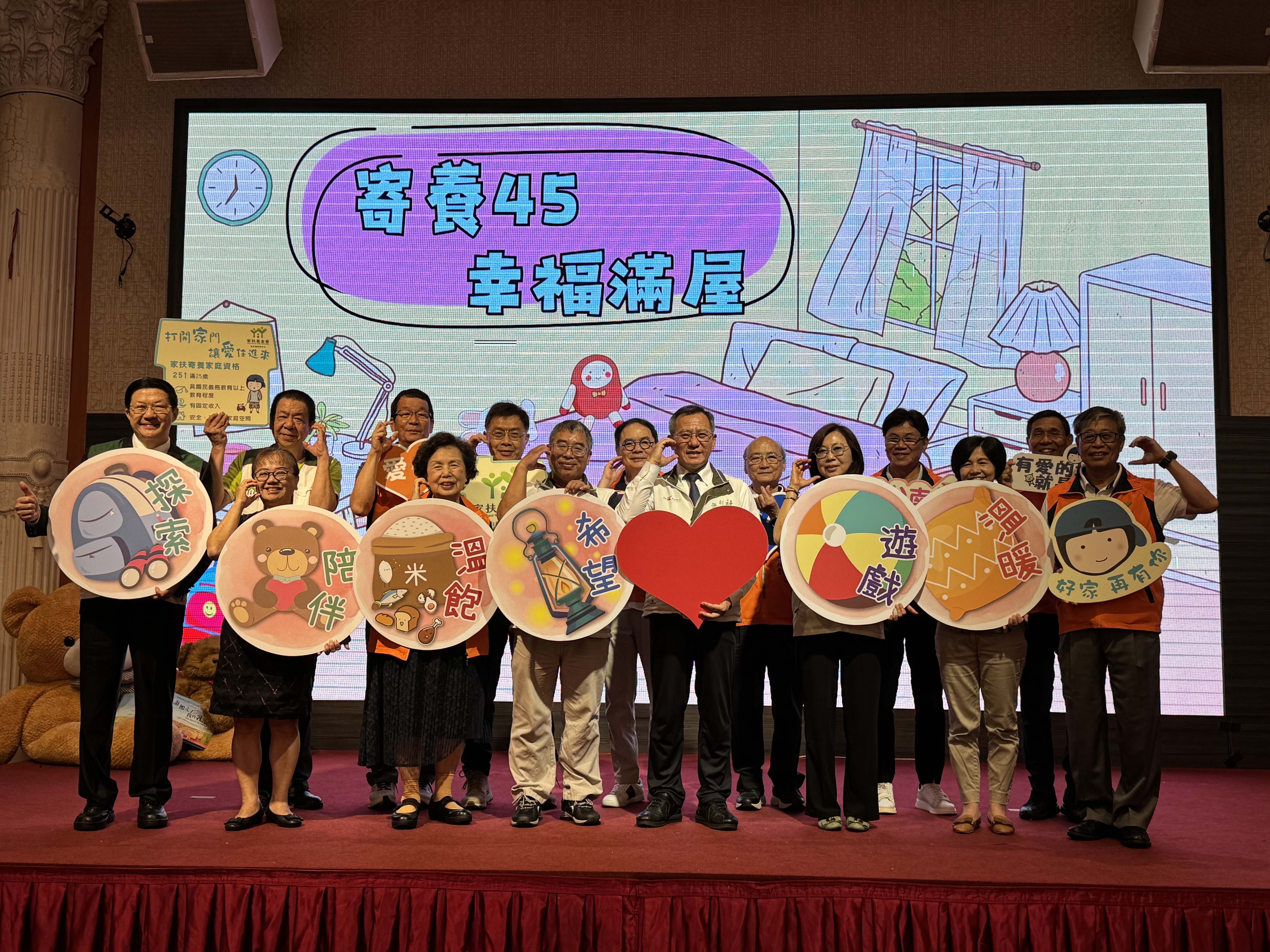 授證典禮中由社會局葉誌明副局長、北家扶呂明憲主委、李桂平主任、南家扶楊政達主委、李保良主任及兩戶寄養家庭代表許春生/林姿巧賢伉儷、鍾月蓉女士等來賓,手持象徵「愛」的愛心、「探索」的背包、「希望」的檯燈、「溫飽」的食物、「遊戲」的球、「溫暖」的抱枕、「陪伴」的小熊等圖示,象徵寄養家庭給予兒少滿滿的愛與陪伴,讓兒少在寄養服務中找回「家」的溫暖概念。